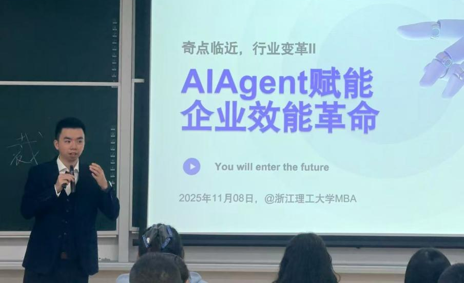 2025年11月8日下午,作为浙江理工大学MBA教育中心品牌学术活动“林启讲堂”系列的重要组成部分,本期特邀求智启新人工智能研究院首席专家、浙江大学跨界创新俱乐部主席、多家国央企/世界500强特邀AI讲师陈灵军,开展“AI Agent赋能企业效能变革”主题学术讲座。活动由人力资源管理系系主任王萍主持,MBA师生共同参与,深入学习AI深度应用与工作提效技巧。